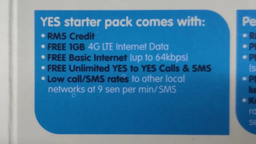 A Yes Prepaid SIM card costs 10 MYR and comes with: