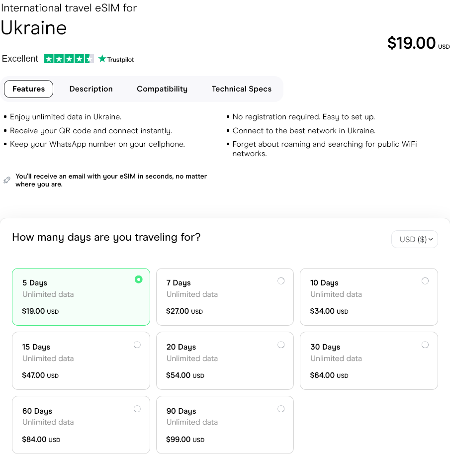 - Ukraine/Lavranet 1 GB eSIM for 7 days, costing 4.50 USD